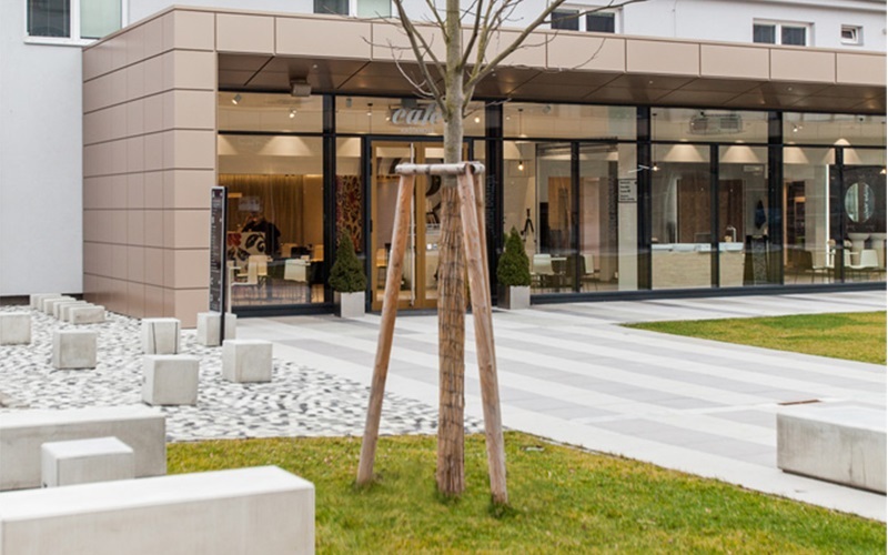 We considered an appropriate form of a centre for living and design with these laws in mind. The site is located at the end of a typical industrial area and the centre wouldn't stand a chance at all if something unexpected and surprising didn't start happening here. Imagine driving down a narrow road, entering an industrial zone with no clearly held concept, and finding two golden boxes at the end, facing each other through glass portals and containing design showrooms and a pleasant café. In addition, a perfectly cut English lawn stretches between these portals. Thanks to the previous experience of travelling through the complex, you are very pleasantly surprised, perhaps even shocked, because you really wouldn't expect this here.