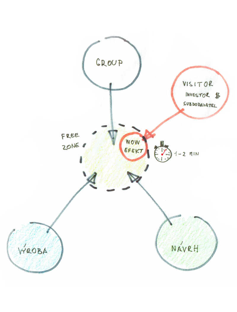 Na této realizaci jsme si nicméně prověřili, že určitá míra poetičnosti nebo neracionálního tvaru muže v čistě ortogonálním prostoru vyvolat příjemnou změnu, dynamiku a také překvapivě silné ovládnutí okolního prostoru. Toto působení jsme umocnili pomocí užití průhledné látky, jejíž měkkost kontrastuje s ostatními tvrdými materiály jako je sklo nebo beton.